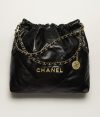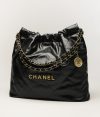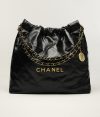 This 22 Hobo Bag is in metallic black calfskin with gold tone hardware, CHANEL on the front in gold tone metal, a short gold tone and leather interwoven chain, a long one, and a long leather cord strap.