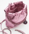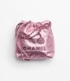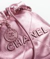 Measurements: 7.8 × 7.4 × 2.3 in / 20 × 19 × 6 cm The Chanel Mini 22 Hobo Bag is crafted from pink metallic calfskin with pink hardware and signature diamond quilting, a pink lacquered metal 'Chanel' signature on the front, a Chanel Paris metal hangtag, pink metallic leather interlaced chain links, a long leather cord and a long chain link shoulder strap. The interior is lined with pink fabric and has a slip pocket on the back wall.