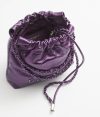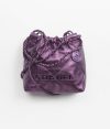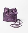 This Chanel Mini 22 Hobo bag is made of dark purple lacquered metallic calfskin with dark purple hardware and signature diamond quilting, dark lacquered metal “Chanel” logo on the front, Chanel Paris metal hangtag, dark purple metallic leather interwoven chain links, long leather cord and long chain link shoulder strap.