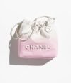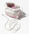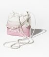 This Chanel Mini 22 Hobo bag is made of white and light pink gradient metallic calfskin with white hardware and signature diamond quilting, white lacquered metal “Chanel” logo on the front, Chanel Paris metal hangtag, white metal and white leather interlaced chain links, long leather cord and long chain link shoulder strap.