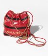 This mini 22 Hobo bag is made of red and black calfskin with gold-tone hardware, features signature diamond quilting, gold-tone metal CHANEL lettering on the front, and a long chain interwoven with gold and red leather.