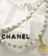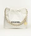 This Small 22 Hobo in white calfskin with gold hardware, black metal CHANEL on the front, gold and leather interlaced short chain, long chain and long leather cord shoulder strap.