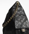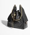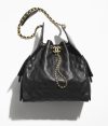 This Chanel Medium 25 Hobo Bag is in black caviar leather with antique gold hardware, features signature diamond quilt, two exterior side pockets, drawstring closure, a removable pouch, and a single interwoven brushed gold and Black leather shoulder strap.