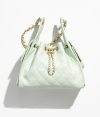 This Chanel Small 25 Hobo Bag is in light green caviar leather with antique gold hardware, features signature diamond quilt, two exterior side pockets, drawstring closure, and a single interwoven antique gold and black leather shoulder strap.