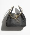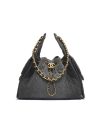 The Chanel Small 25 Hobo Bag is crafted from black washed denim with antique gold hardware and features signature diamond quilting, two exterior pockets, a drawstring closure, and an interwoven antique gold and black leather shoulder strap.
