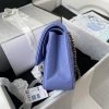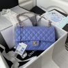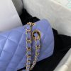 Measurements: 6 x 9.9 x 2.5 in / 15.5 × 25.5 × 6.5 cm This medium classic double flap bag is crafted in lavender lambskin leather with light gold hardware, featuring the signature CC turnlock closure on the front flap, half-moon back pocket, adjustable interwoven light gold chain and lavender leather shoulder strap. The interior is lined with lavender leather and features a "love letter" zip compartment under the first flap, an "outside" open pocket under the second flap, and an interior compartment with two open pockets separated by a "lipstick" compartment in the middle.
