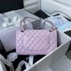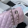 Measurements: 6 x 9.9 x 2.5 in / 15.5 × 25.5 × 6.5 cm This medium classic double flap bag is crafted in lilac lambskin with silver-tone hardware, featuring the signature CC turnlock closure on the front flap, half-moon back pocket, adjustable interwoven silver-tone chain and lilac leather shoulder strap. The interior is lined with lilac leather, with a "love letter" zippered compartment under the first flap, an "outside" open pocket under the second flap, and an interior compartment with two open pockets and a "lipstick" compartment in the middle.