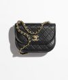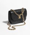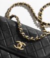 Measurements: 6.4 × 9.2 × 2.1 in / 16.5 × 23.5 × 5.5 cm This flap bag is crafted from black quilted caviar leather with antique gold hardware and features a CC logo front flap, antique gold chain links and a black leather padded shoulder/crossbody strap. The interior is lined with black leather and has a half-moon pocket on the back.