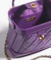 This Chanel Mini Top Handle Flap Bag is crafted from purple shiny lambskin with light gold hardware, the trapezoidal design features signature diamond quilting, signature interlocking CC clasp, top handles and a long light gold and purple leather chain.