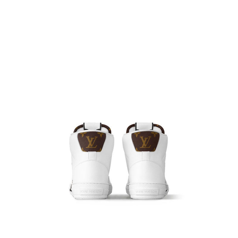 The Charlie sneaker boot is Louis Vuitton’s first eco-designed hi-top. Crafted from 90% sustainable materials, it comes in an all-white version with Monogram accents, in particular Monogram textile trim made from recycled polyester on the back, and an embroidered LV Initials logo on the side. This model is finished with a recycled rubber outsole and recycled polyester laces.