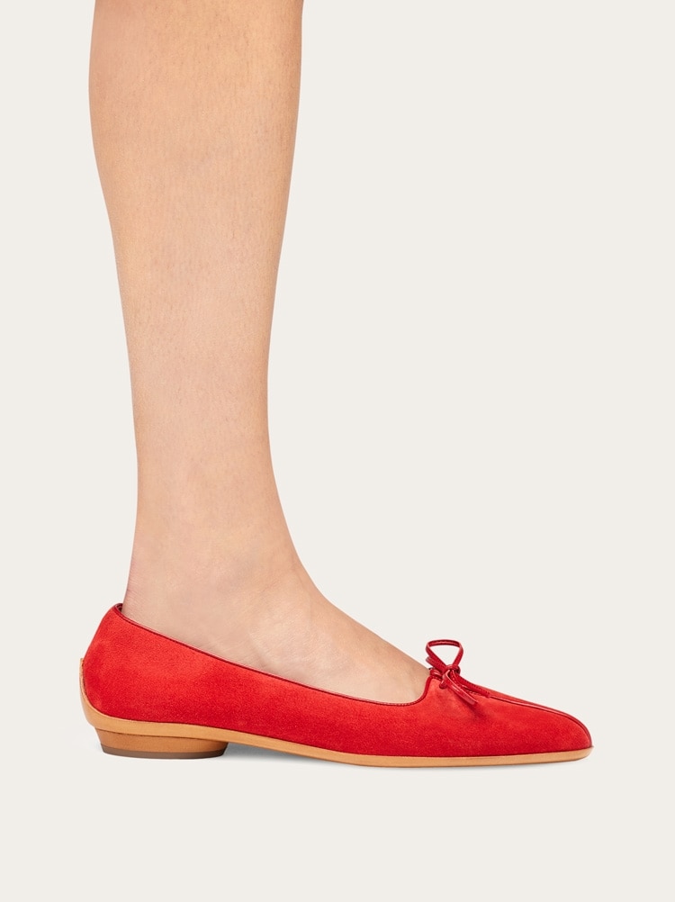 Originally envisioned by Salvatore Ferragamo in 1958, this suede ballet flat model was created for the legendary actress Marilyn Monroe. Adorned with a delicate tie and featuring a distinctive shell-shaped sole, the ballet flat is a combination of vintage charm and timeless sophistication.