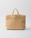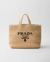 This tote bag with a soft, deconstructed design is made of raffia-effect yarn, a light material with a summery mood. Prada's large, iconic lettering logo embroidered on the front enhances the silhouette.