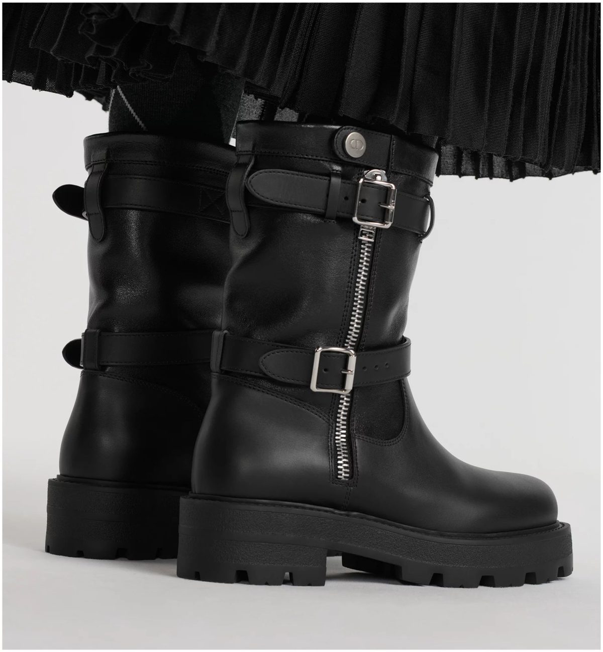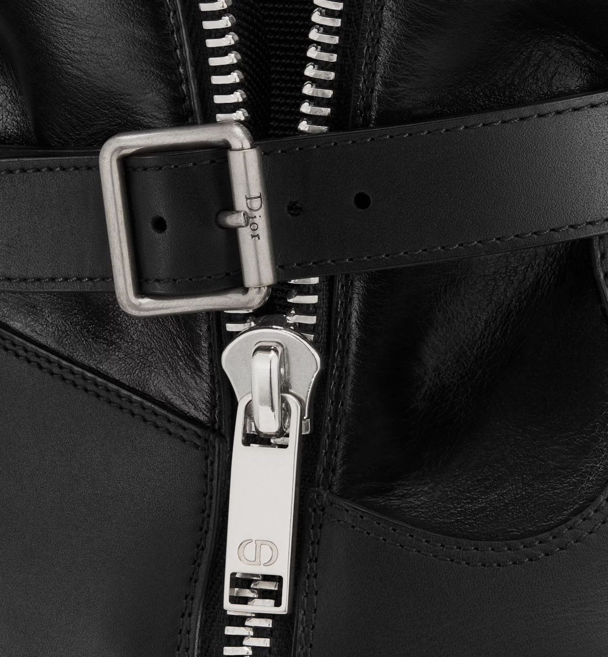 New for Cruise 2025, the D-Major ankle boot gives a modern look to a bold design. The black calfskin upper features a zip closure and two adjustable buckle straps showcasing a tonal technical fabric lining with the Christian Dior Paris signature, allowing for varying styles by wearing it open or closed. Completed by a thick yet ultralightweight notched sole, the ankle boot will lend a contemporary touch to any look.