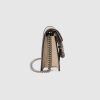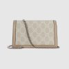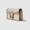 A new edition of the Dionysus is showcased throughout Gucci Love Parade. The bag is presented in a super mini size in an evolution of the classic GG Supreme canvas. A soft color palette, the petite design takes on a refined feel in the colors of beige and white, drawing attention to its recognizable tiger head hardware.