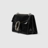 A soft, deconstructed version of the signature Dionysus shoulder bag presents a contemporary look. This style in sleek black patent leather features the iconic tiger head closure with a flap and a sliding chain that can be worn both as a shoulder bag and a top handle bag, giving it many possibilities to wear.