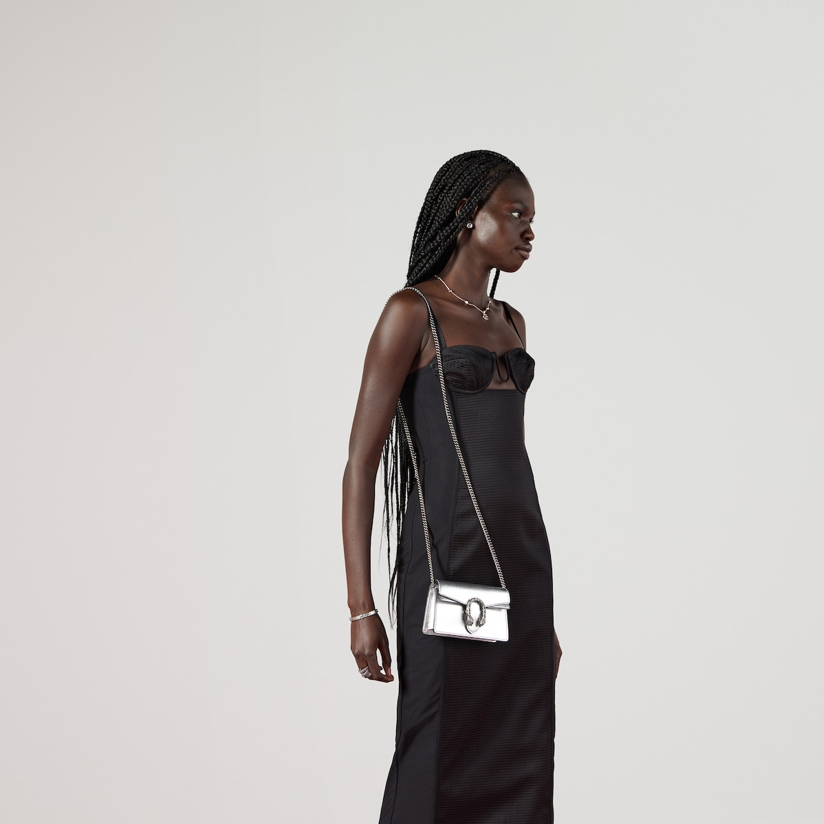 The structured super mini bag is introduced in metallic silver leather, with a key ring that can be used to attach the bag to a separate larger bag. The closure features the textured tiger head spur—the unique detail defines the line, referencing the Greek god Dionysus, who in myth is said to have crossed the river Tigris on a tiger sent to him by Zeus.