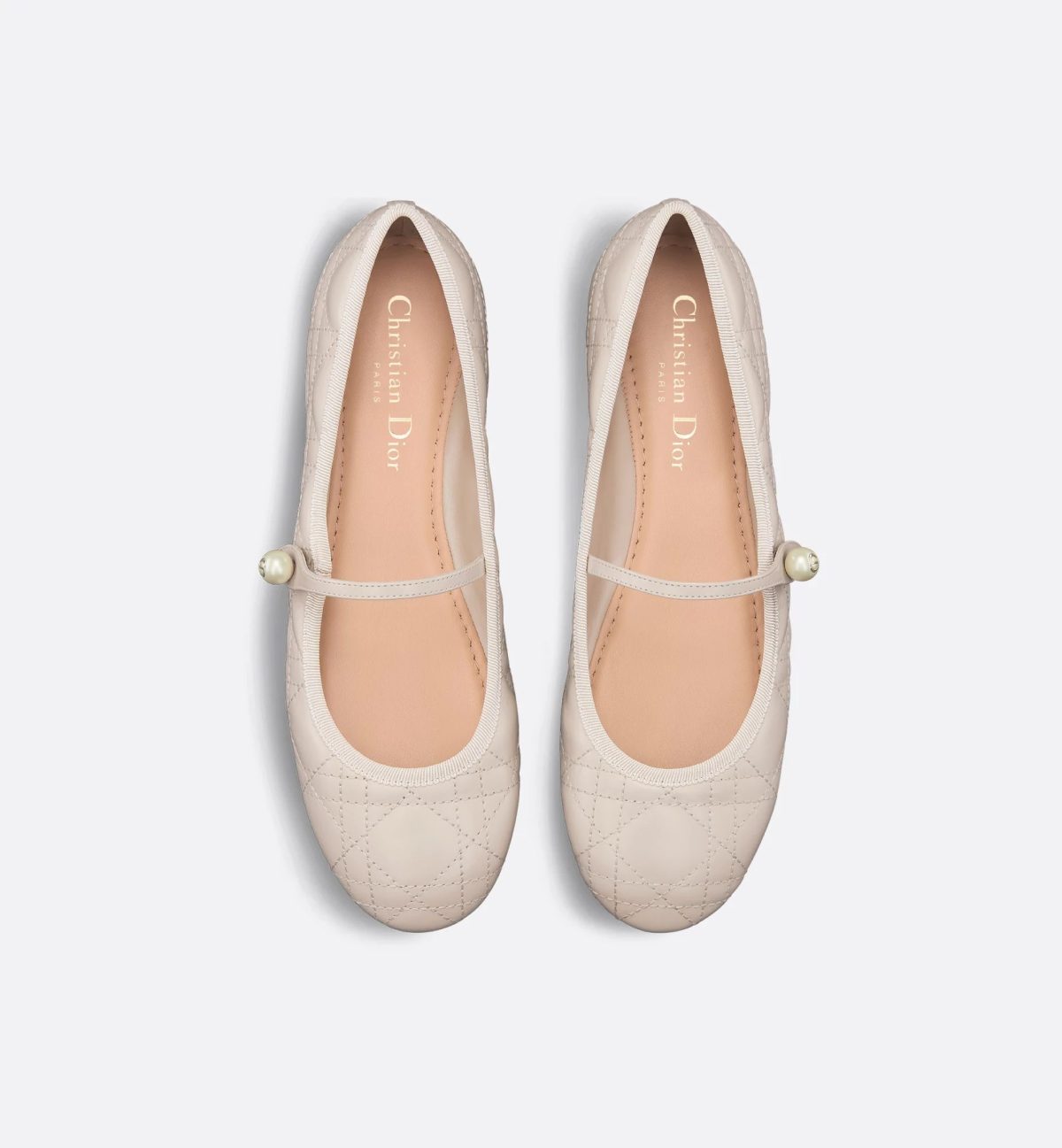 The Dior Ballet flat revisits the Mary Jane with elements of House couture. Crafted in light biscuit quilted calfskin with the Cannage motif, it is distinguished by a leather strap with elastic and a white CD resin pearl inspired by the iconic Dior Tribales earrings. Featuring a padded leather insole, the supple, comfortable ballet flat will add the finishing touch to any of the season's looks.