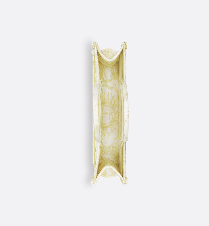 • Part of the Dioriviera capsule, Maria Grazia Chiuri's newest Dior Book Tote is updated with a new East-West format. The style is entirely embroidered with the Toile de Jouy Soleil motif in lemon yellow, offering a new take on the iconic House pattern with suns and crescent moons layered into a floral arrangement representing the four seasons. Designed to keep daily items organized, the practical tote is a prime example of Dior's savoir-faire and can be carried by hand or worn over the shoulder.