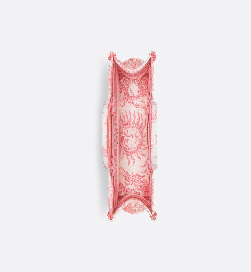 • New for Fall 2024 and part of the Dioriviera capsule, Maria Grazia Chiuri's Dior Book Tote is updated with a new East-West format. The style is entirely embroidered with the Toile de Jouy Soleil motif in candy pink, offering a new take on the iconic House pattern with suns and crescent moons layered into a floral arrangement representing the four seasons. Designed to keep daily items organized, the practical tote is a prime example of Dior's savoir-faire and can be carried by hand or worn over the shoulder.