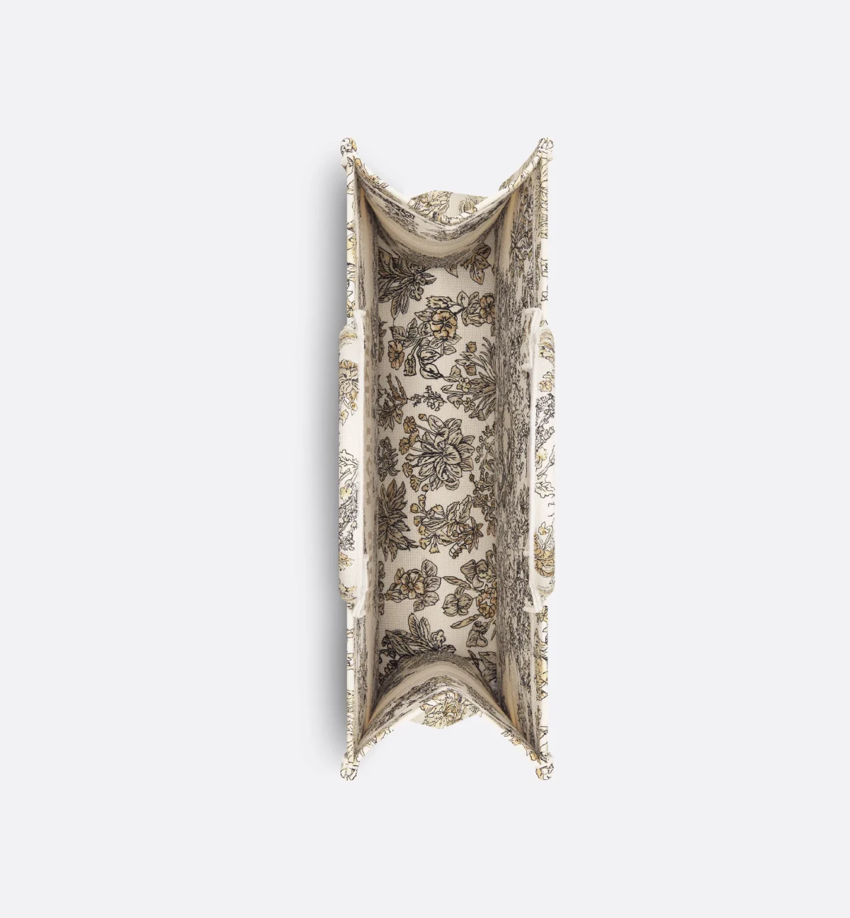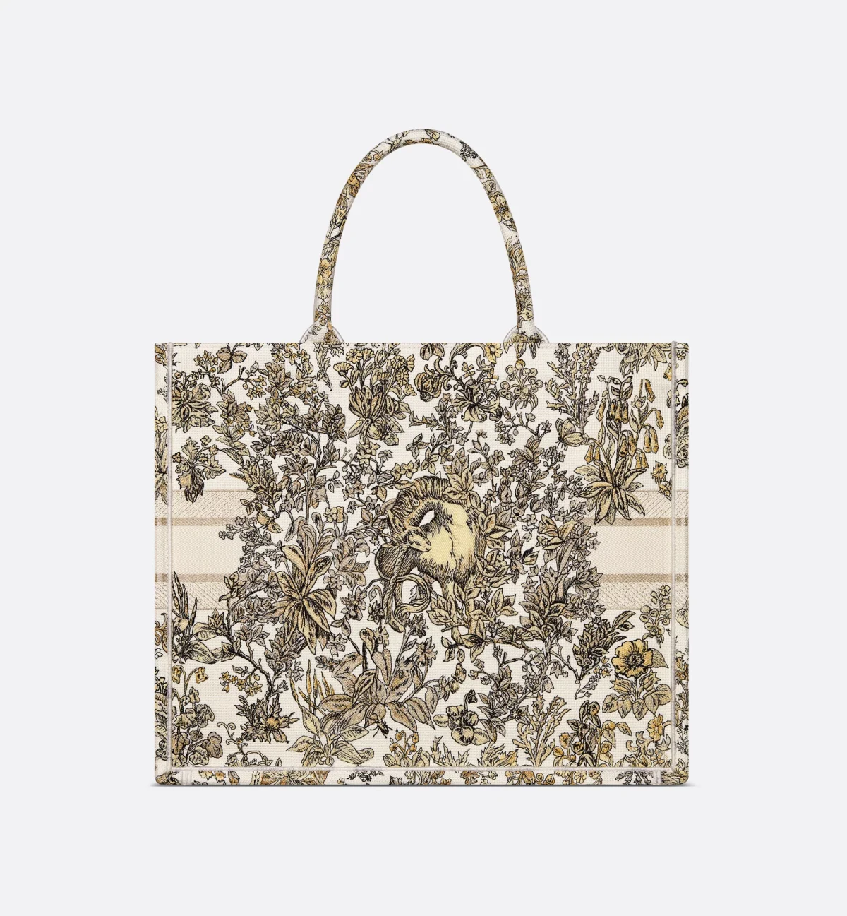 • Introduced by Maria Grazia Chiuri, Creative Director of Christian Dior, the Dior Book Tote has become a staple of the Dior aesthetic. Created to hold all the daily essentials, the latte style is fully embroidered with the gold-tone Millefiori Unicorn motif by Pietro Ruffo, showcasing a symbol from Scottish mythology, the unicorn, within a poetic floral pattern. Adorned with the Christian Dior Paris signature on the front, the large tote exemplifies the House's savoir-faire and can be carried by hand or worn over the shoulder. The bag can be coordinated with the season's other Millefiori Unicorn creations.