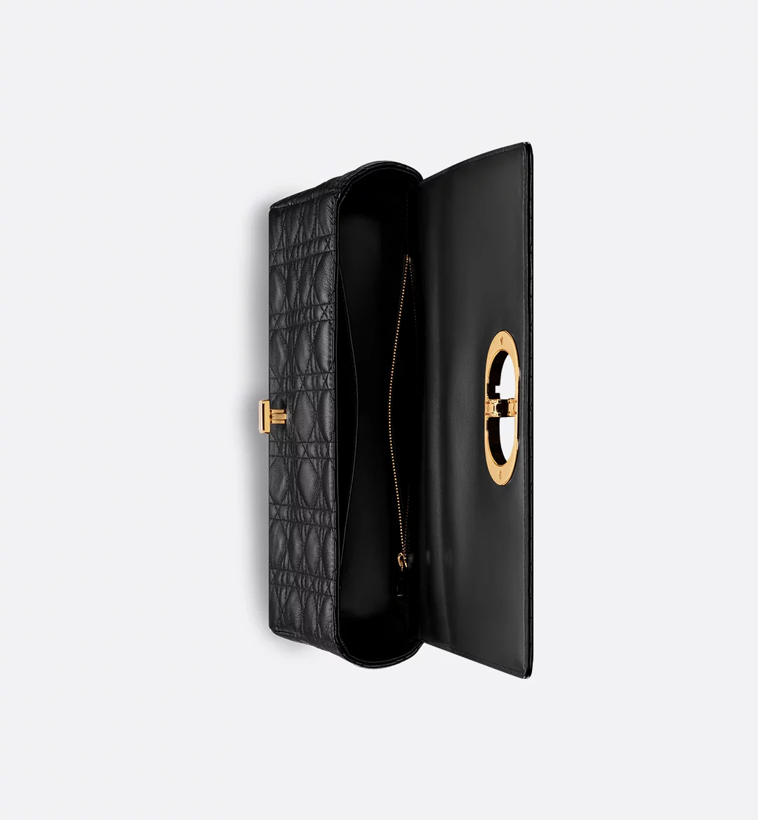 • The Dior Caro bag combines modernity with timeless elegance. The silhouette is crafted in black supple calfskin with Cannage stitching. The bag features a flap adorned with an antique gold-finish metal CD twist clasp, inspired by the seal of a Christian Dior perfume bottle. The detachable chain strap with CD signature links allows the large bag to be carried by hand, worn over the shoulder or crossbody, and may be replaced by one of the House’s wide embroidered straps for day or evening attire.