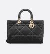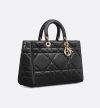 • The Lady D-Sire bag is inspired by the elegance of the iconic Lady Dior, revisited with the urban aesthetic of a supple and unstructured form. The black calfskin showcases Maxicannage topstitching in a nod to the House hallmark, while pale gold-finish metal D.I.O.R. charms accent the silhouette. Featuring a thin, removable leather shoulder strap, the unique large bag can be carried by hand or worn over the shoulder.