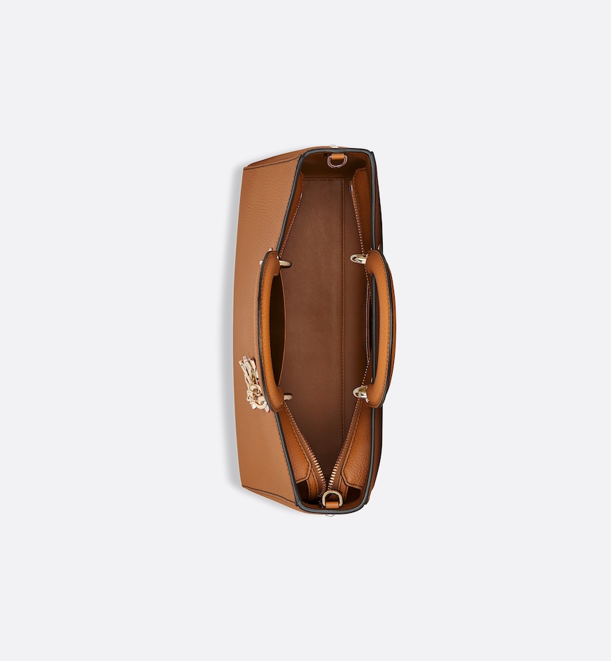 • New for Summer 2024, the Lady D-Sire bag draws inspiration from the signature elegance of the Lady Dior design. Reimagined with a casual style for an urban look, the lightweight dark brandy grained Taurillon leather feels soft to the touch yet offers excellent durability. The large style is embellished with pale gold-finish metal D.I.O.R. charms highlighting the silhouette. Showcasing a removable, thin leather shoulder strap, the unique bag can be carried by hand or over the shoulder.