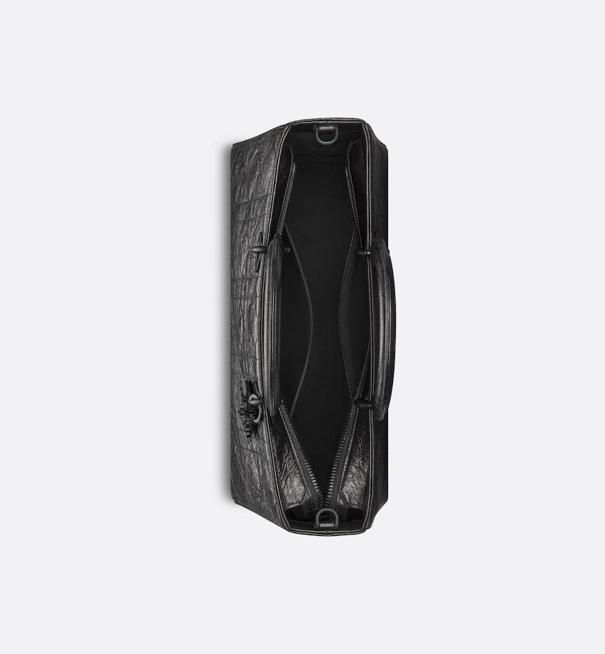 • New for the season and appearing in the Spring-Summer 2024 Fashion Show, the Lady D-Sire bag draws inspiration from the iconic elegance of the Lady Dior design. Reimagined with a casual style for an urban look, the black crinkled calfskin is accented by Macrocannage topstitching, while tonal ultra-matte metal D.I.O.R. charms lend a modern touch. Featuring a thin, removable leather shoulder strap, the unique large bag can be carried by hand or worn over the shoulder.