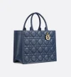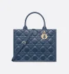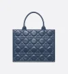 • Maria Grazia Chiuri's hallmark Dior Book Tote is presented in an elegant new variation. Crafted in deep ocean blue calfskin, the design showcases the Macrocannage motif and is embellished with pale gold-finish metal D.I.O.R charms. The cashmere leather interior reveals a zip pocket and slip pockets, ideal for organizing all the daily essentials. Featuring an adjustable and removable strap, the lightweight and practical medium tote exemplifies Dior savoir-faire and may be carried by hand or worn over the shoulder.