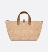 • The Dior Toujours bag is distinguished by a casual and practical design. Crafted in beige raffia, it showcases the Graphic Cannage motif, offering a modern 3D version of the House icon. The style features a spacious interior compartment with a matching pouch to organize the essentials. Its thin leather strap closure keeps items secure while the D of the CD Lock clasp twists to adjust the sides and enhance the bag’s silhouette. The leather top handles can be adjusted using the small notches so the medium bag can be carried by hand or worn over the shoulder.