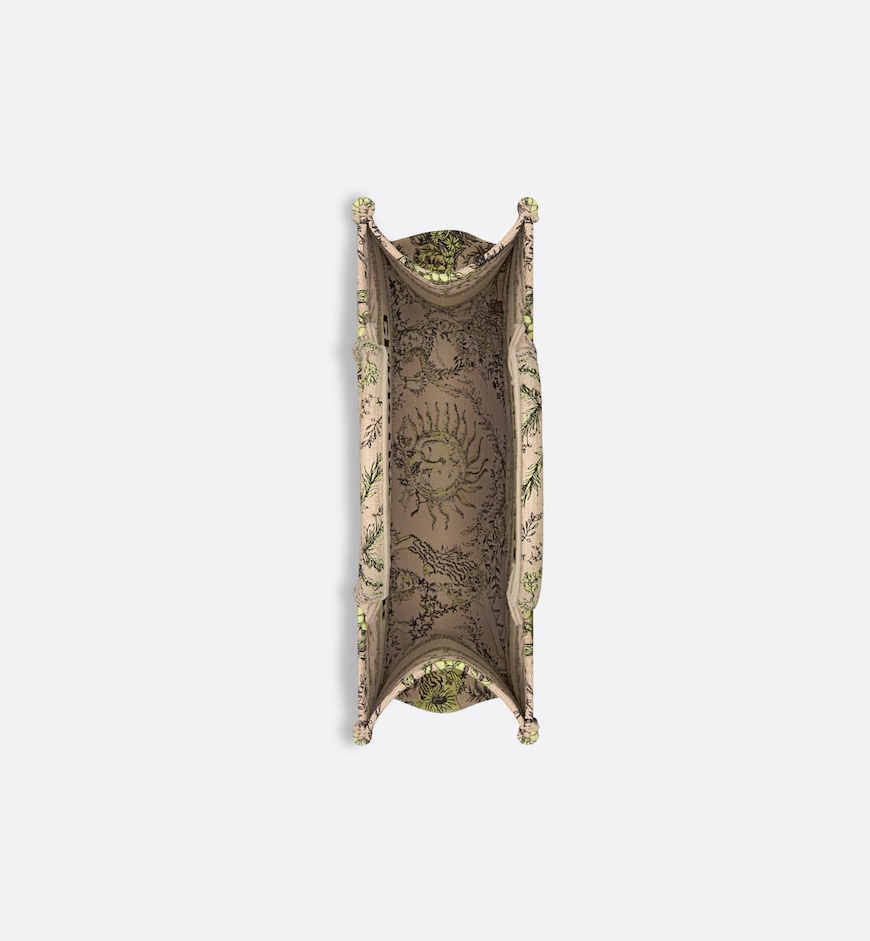 • Introduced by Maria Grazia Chiuri, Creative Director of Christian Dior, the Dior Book Tote has become a staple of the Dior aesthetic and is part of the Dioriviera capsule. Designed to hold all the daily essentials, the style is crafted in raffia embroidered with the Toile de Jouy Soleil motif in lemon yellow, offering a new take on the House icon layering suns and crescent moons into a floral pattern representing the four seasons. Exemplifying House savoir-faire, the medium tote is adorned with the Christian Dior Paris signature on the front. It can be carried by hand or worn over the shoulder.