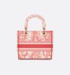 • Part of the Dioriviera capsule, the Lady D-Lite bag captures the House’s vision of classic elegance and modernity. It is fully embroidered with the Toile de Jouy Soleil motif in coral, offering a new take on the iconic House pattern with suns and crescent moons layered into a floral design representing the four seasons. The front is accented by a Christian Dior Paris signature while pale gold-finish metal D.I.O.R. charms embellish and illuminate the silhouette. Featuring a wide, removable embroidered shoulder strap, the medium Lady D-Lite bag can be carried by hand or worn crossbody.