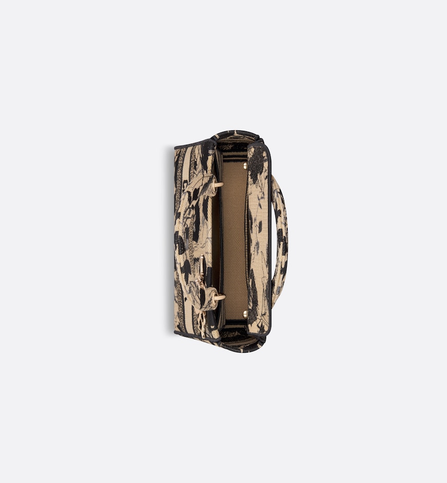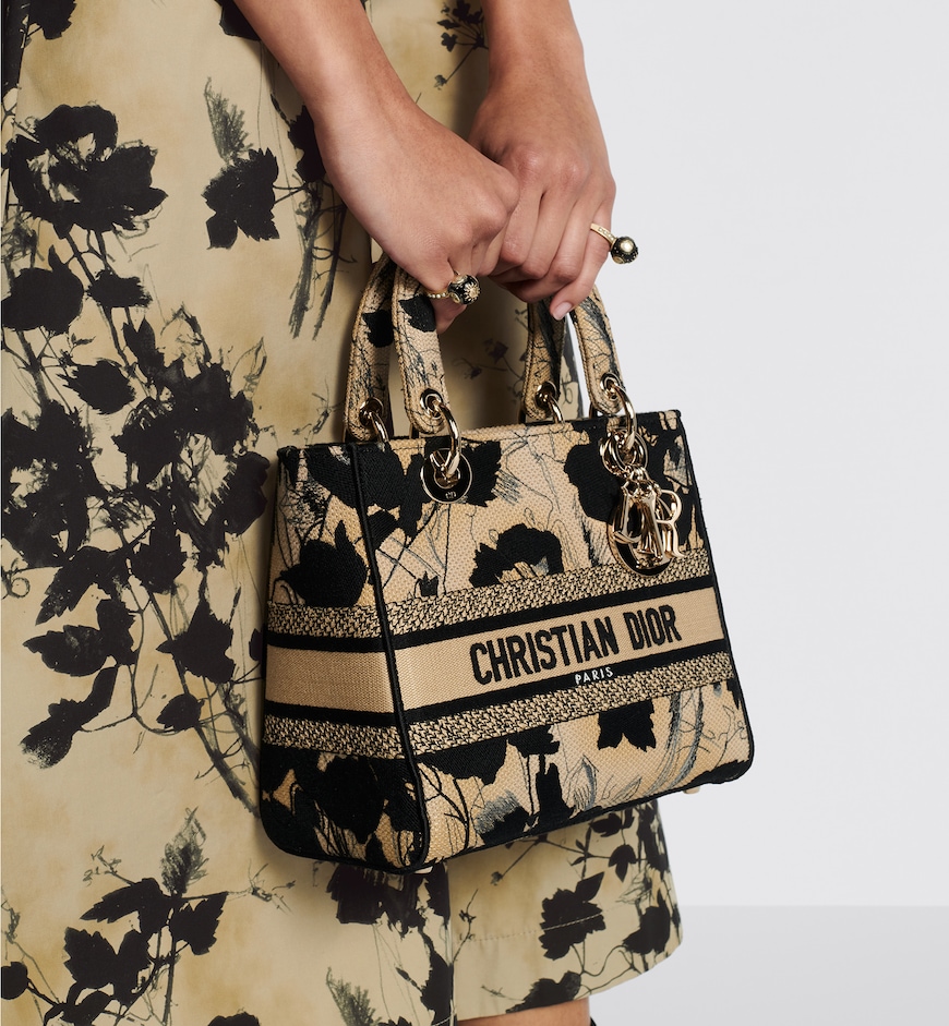 • The Lady D-Lite bag embodies the House’s classic elegance and modernity. The style is fully embroidered with the Fleurs Mystiques motif in beige and black, a hypnotic and poetic floral pattern, while pale gold-finish metal D.I.O.R. charms embellish and illuminate the silhouette. Featuring a wide, removable embroidered shoulder strap, the medium Lady D-Lite bag can be carried by hand or worn crossbody.