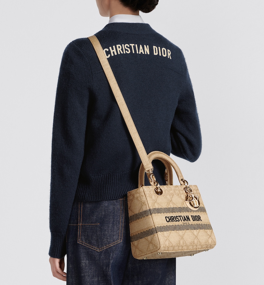 • The Lady D-Lite bag combines classic elegance with House modernity. Crafted in natural raffia, it showcases hallmark Cannage stitching. A Christian Dior Paris signature adorns the front, while D.I.O.R. charms in pale gold-finish metal further enhance and highlight the silhouette. Featuring a wide, removable and reversible embroidered shoulder strap, the medium Lady D-Lite bag can be carried by hand or worn crossbody.