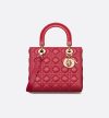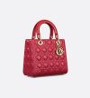 • The Lady Dior bag epitomizes the House’s vision of elegance and beauty. Sleek and refined, the timeless yet relevant style is crafted in cherry red lambskin with Cannage stitching, creating the instantly recognizable quilted texture. The pale gold-finish metal signature D.I.O.R. charms offer elegant appeal. Featuring a thin, removable leather shoulder strap, the medium Lady Dior bag can be carried by hand, worn over the