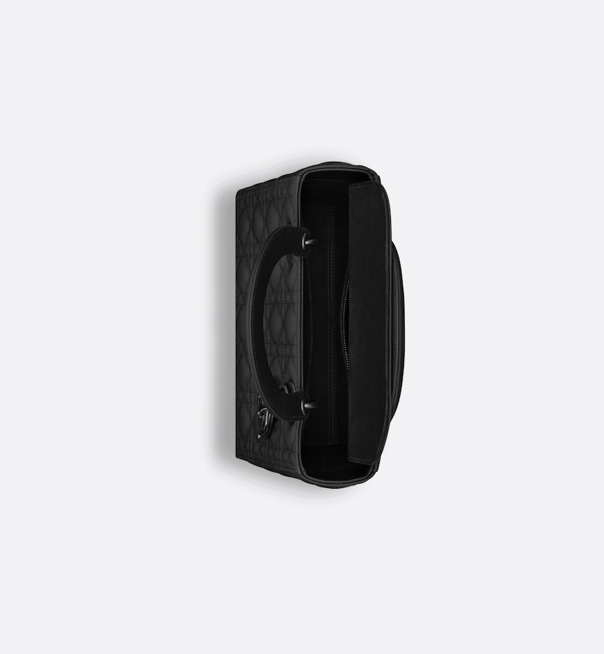 • The Lady Dior bag epitomizes the House’s vision of elegance and beauty. Sleek and refined, the timeless yet relevant style is crafted in black ultramatte calfskin with Cannage stitching, creating the instantly recognizable quilted texture. The tonal metal D.I.O.R. charms complete and illuminate the silhouette. Featuring a thin, removable leather strap, the medium Lady Dior bag can be carried by hand, worn over the
