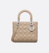 • The Lady Dior bag embodies the House's vision of elegance and beauty. Sleek and refined, the style is timeless. Crafted in sand-colored grained calfskin with Cannage stitching, the bag presents the instantly recognizable quilted texture, while silver-finish metal D.I.O.R. charms offer a modern touch. Featuring a thin, removable leather shoulder strap, the medium Lady Dior bag can be carried by hand or worn crossbody.