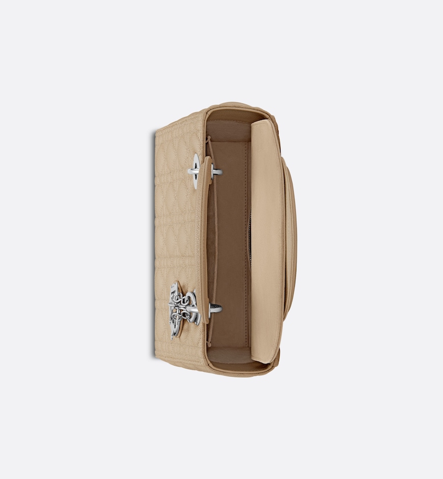 • The Lady Dior bag embodies the House's vision of elegance and beauty. Sleek and refined, the style is timeless. Crafted in sand-colored grained calfskin with Cannage stitching, the bag presents the instantly recognizable quilted texture, while silver-finish metal D.I.O.R. charms offer a modern touch. Featuring a thin, removable leather shoulder strap, the medium Lady Dior bag can be carried by hand or worn crossbody.