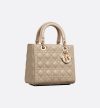 • The Lady Dior bag epitomizes the House's vision of elegance and beauty. Sleek and refined, the style is timeless. It is crafted in sand-colored lambskin with Cannage stitching, creating the instantly recognizable quilted texture. The pale gold-finish metal D.I.O.R. charms offer an elegant touch. Featuring a thin, removable leather shoulder strap, the medium Lady Dior bag can be carried by hand or worn crossbody.