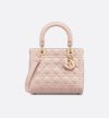 • The Lady Dior bag epitomizes the House’s vision of elegance and beauty. Sleek and refined, the style is timeless. It is crafted in powder pink lambskin with Cannage stitching, creating the instantly recognizable quilted texture. Pale gold-finish metal D.I.O.R. charms lend elegant appeal. Featuring a thin, removable leather shoulder strap, the medium Lady Dior bag may be carried by hand or worn crossbody.
