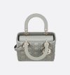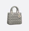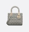 • The Lady Dior bag epitomizes the House's vision of elegance and beauty. Sleek and refined, the timeless style is crafted in stone gray lambskin with Cannage stitching, creating the instantly recognizable quilted texture. The pale gold-finish metal D.I.O.R. charms offer elegant appeal. Featuring a thin, removable leather shoulder strap, the medium Lady Dior bag can be carried by hand or worn crossbody.