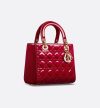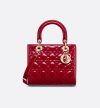 • The Lady Dior bag embodies the House's vision of elegance and beauty. Sleek and refined, the style is timeless. Crafted in cherry red patent calfskin with Cannage stitching, its quilted texture is immediately recognizable. Pale gold-finish metal D.I.O.R. charms complete and illuminate its silhouette. Featuring a thin, removable leather shoulder strap, the medium Lady Dior bag can be carried by hand or worn