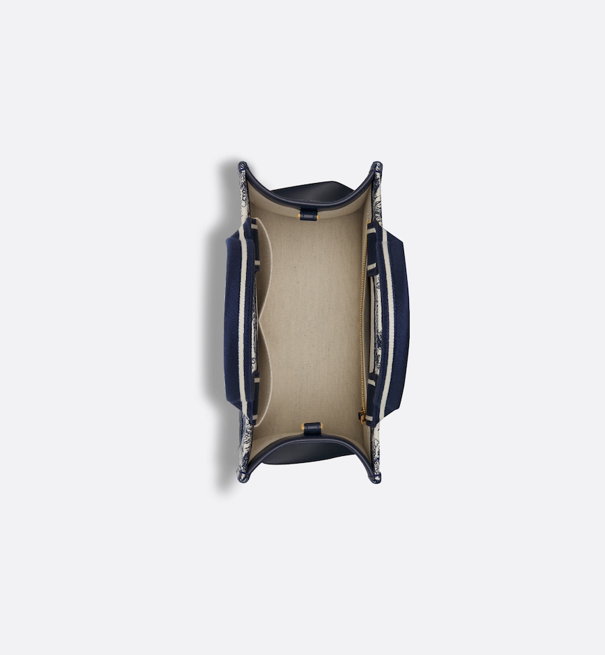• Maria Grazia Chiuri's hallmark Dior Book Tote offers an original take on elegance. The refined style showcases a fresh interpretation of the House's iconic motif with the white and navy blue Toile de Jouy Sauvage embroidery and navy blue calfskin. Designed to keep all the daily essentials organized, the interior is equipped with a zip pocket and slip pockets. Featuring an adjustable and removable strap, the practical small tote exemplifies Dior's savoir-faire and can be carried by hand or worn over the shoulder.