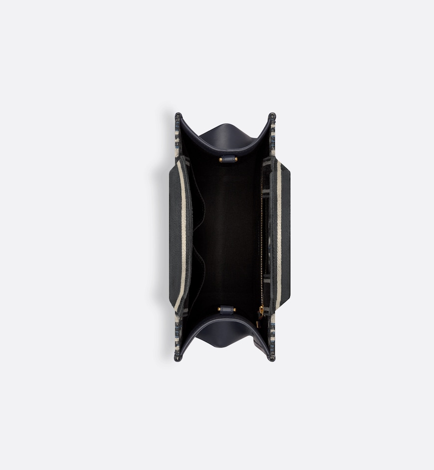 • Maria Grazia Chiuri's hallmark Dior Book Tote is offered in an elegant variation. The refined style showcases an iconic blue Dior Oblique embroidery and calfskin. Designed to keep all daily essentials organized, the interior is equipped with a zip pocket and slip pockets. Featuring an embroidered adjustable, removable strap, the practical small tote exemplifies Dior's savoir-faire and can be carried by hand or worn over the shoulder.