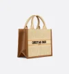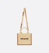• Maria Grazia Chiuri's hallmark Dior Book Tote is presented in an elegant new variation. The refined beige raffia style is embroidered with the Dior Oblique motif and embellished with camel calfskin detailing. Designed to keep all the daily essentials organized, the cashmere leather interior is equipped with a zip pocket and slip pockets. Featuring an adjustable and removable strap and elevated by the Christian Dior Paris signature on the front, the practical small tote exemplifies Dior's savoir-faire and can be carried by hand or worn over the shoulder.