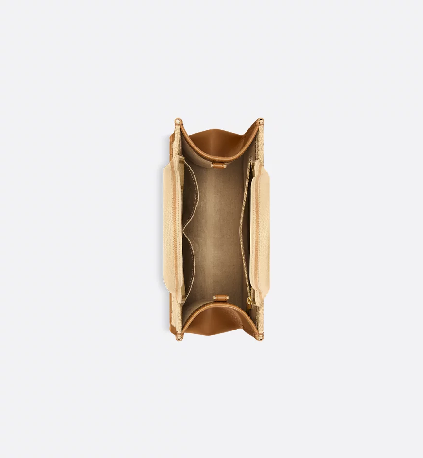 • Maria Grazia Chiuri's hallmark Dior Book Tote is presented in an elegant new variation. The refined beige raffia style is embroidered with the Dior Oblique motif and embellished with camel calfskin detailing. Designed to keep all the daily essentials organized, the cashmere leather interior is equipped with a zip pocket and slip pockets. Featuring an adjustable and removable strap and elevated by the Christian Dior Paris signature on the front, the practical small tote exemplifies Dior's savoir-faire and can be carried by hand or worn over the shoulder.