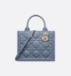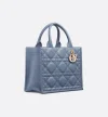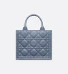 • Maria Grazia Chiuri's hallmark Dior Book Tote is presented in an elegant new variation. Crafted in denim blue calfskin, the design showcases the Macrocannage motif and is embellished with pale gold-finish metal D.I.O.R charms. The cashmere leather interior reveals a zip pocket and slip pockets, ideal for organizing all the daily essentials. Featuring an adjustable and removable strap, the lightweight and practical small tote exemplifies Dior savoir-faire and may be carried by hand or worn over the shoulder.