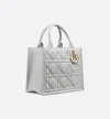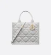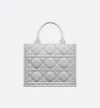• Maria Grazia Chiuri's hallmark Dior Book Tote is presented in an elegant new variation. Crafted in cloud gray calfskin, the design showcases the Macrocannage motif and is embellished with pale gold-finish metal D.I.O.R charms. The cashmere leather interior reveals a zip pocket and slip pockets, ideal for organizing all the daily essentials. Featuring an adjustable and removable strap, the lightweight and practical small tote exemplifies Dior savoir-faire and may be carried by hand or worn over the shoulder.
