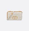 • The Dior Caro bag combines modernity with timeless elegance. The style is crafted in ivory supple calfskin with Cannage stitching. The bag showcases a flap adorned with an antique gold-finish metal CD twist clasp, inspired by the seal of a Christian Dior perfume bottle. The detachable chain shoulder strap with CD signature links allows the small bag to be carried by hand, worn over the shoulder or crossbody, and may be replaced by one of the House’s wide embroidered straps for day or evening attire.