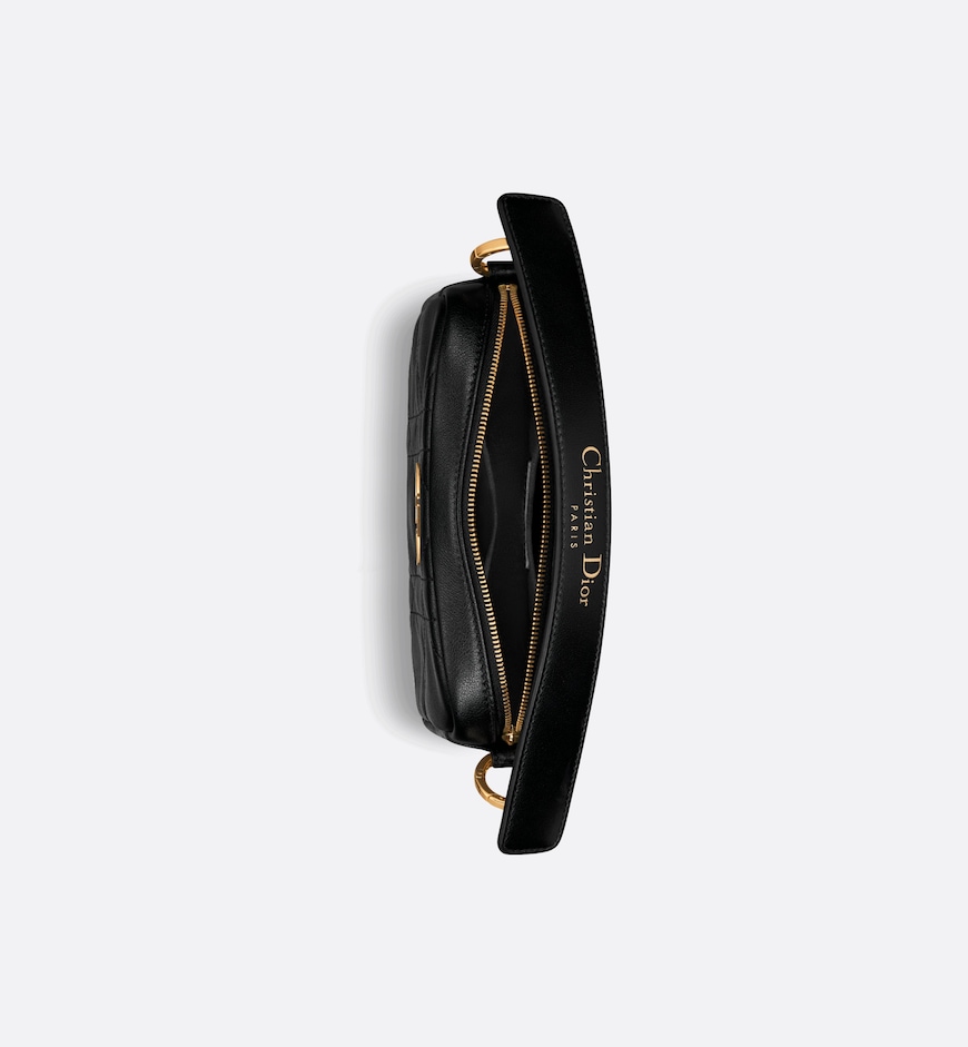 • New for the Summer 2024 season, the Dior Caro Top Handle Camera bag is a sophisticated and practical design. Crafted in black calfskin, the small model is elevated by the originality of the Macrocannage stitching’s quilted effect. The bag features a zip closure and an antique gold-tone metal CD signature. The detachable top handle with Christian Dior Paris signature is completed by the removable chain shoulder strap with CD signature links, allowing it to be carried by hand, on the shoulder, or crossbody, for both day and evening wear.